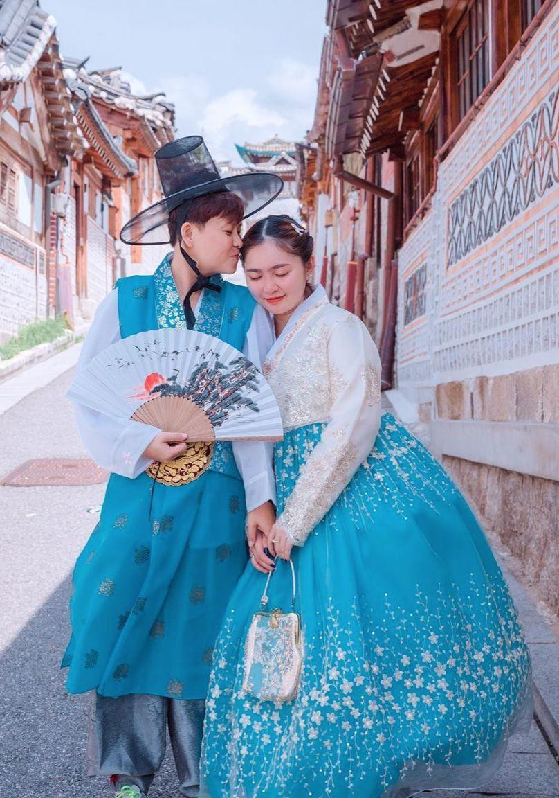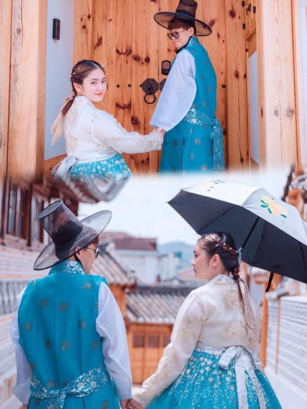 Không những thế, cặp đôi còn mặc Hanbok (trang phục truyền thống Hàn Quốc) và chụp một bộ ảnh "tình bể bình". Nhiều người đồn đoán đây là bộ ảnh cưới của cặp đôi vì cả hai đã cập nhật mối quan hệ thành "đã kết hôn" vào tháng 6 ở trang Facebook cá nhân. Quán quân Giọng hát Việt nhí 2014 cũng từng chia sẻ cả hai đã sống chung nhà với nhau.