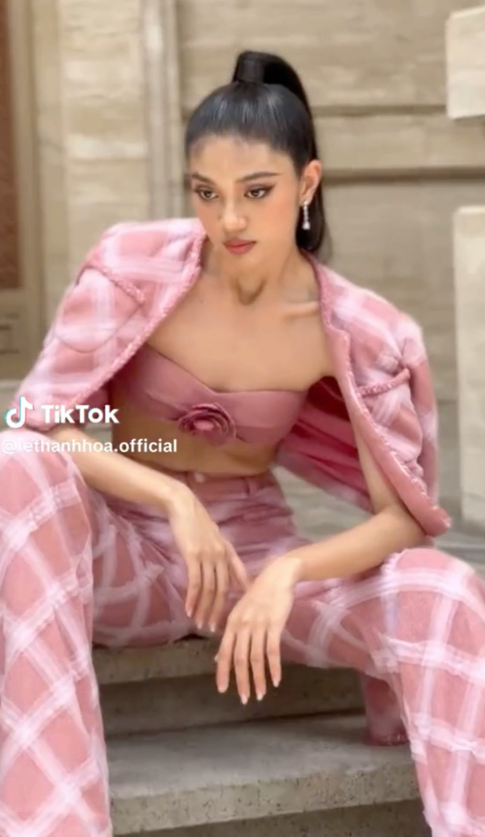 Trong một vài video được NTK Lê Thanh Hòa chia sẻ trên trang cá nhân, có thể thấy Á hậu Minh Kiên phiên bản người mẫu cũng rất thu hút. Người đẹp mặc set trang phục với áo bra kiểu dáng crop-top, khoe cơ bụng và vòng eo nhỏ xíu, đặc biệt thần thái lạnh lùng pha chút bất cần của Minh Kiên khác hẳn các đàn chị từng diện thiết kế tương tự.