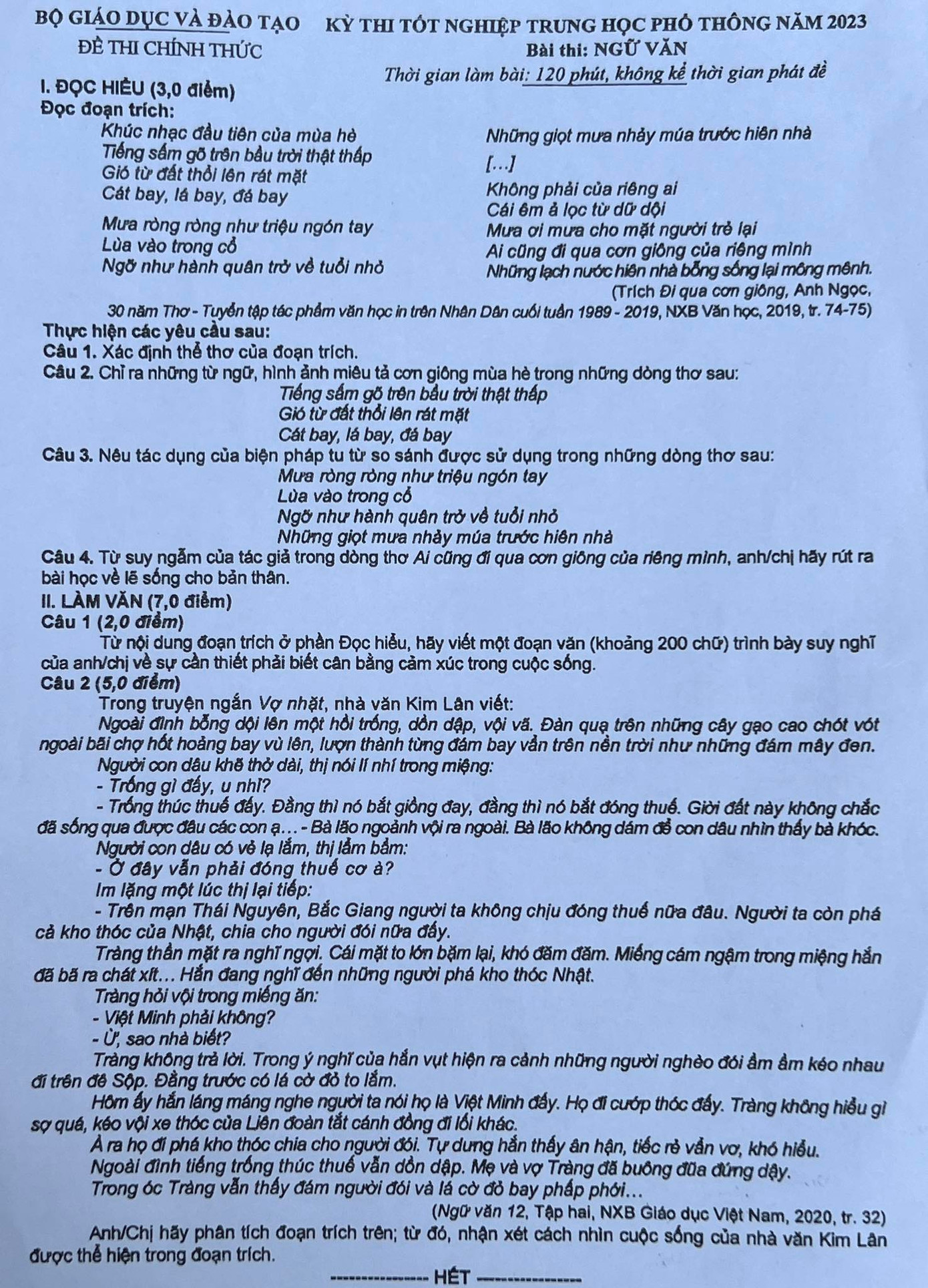 Theo như đề thi chính thức môn Ngữ văn kỳ thi tốt nghiệp THPT năm 2023, phần Đọc hiểu của môn Ngữ văn bao gồm các câu hỏi về xác định thể thơ, chỉ ra các từ ngữ, hình ảnh miêu tả và nêu tác dụng của biện pháp tu từ. Ở 3 câu hỏi đầu tiên này, các thí sinh chỉ cần nắm kiến thức và nhận diện đúng các dấu hiệu của thể loại thơ, các biện pháp tu từ là được.