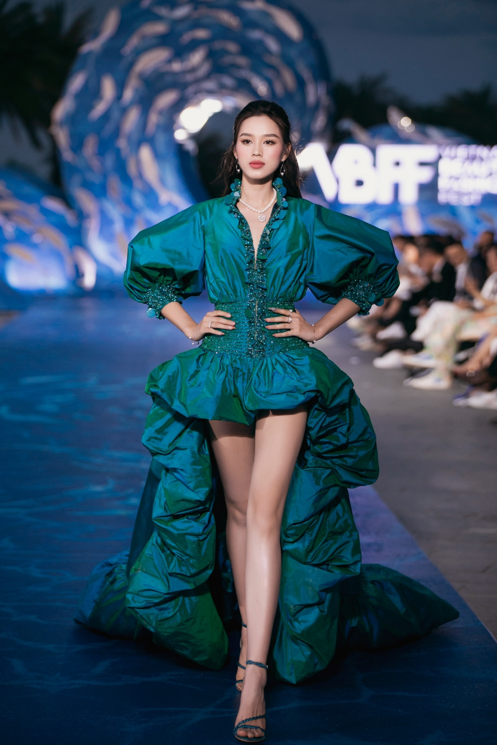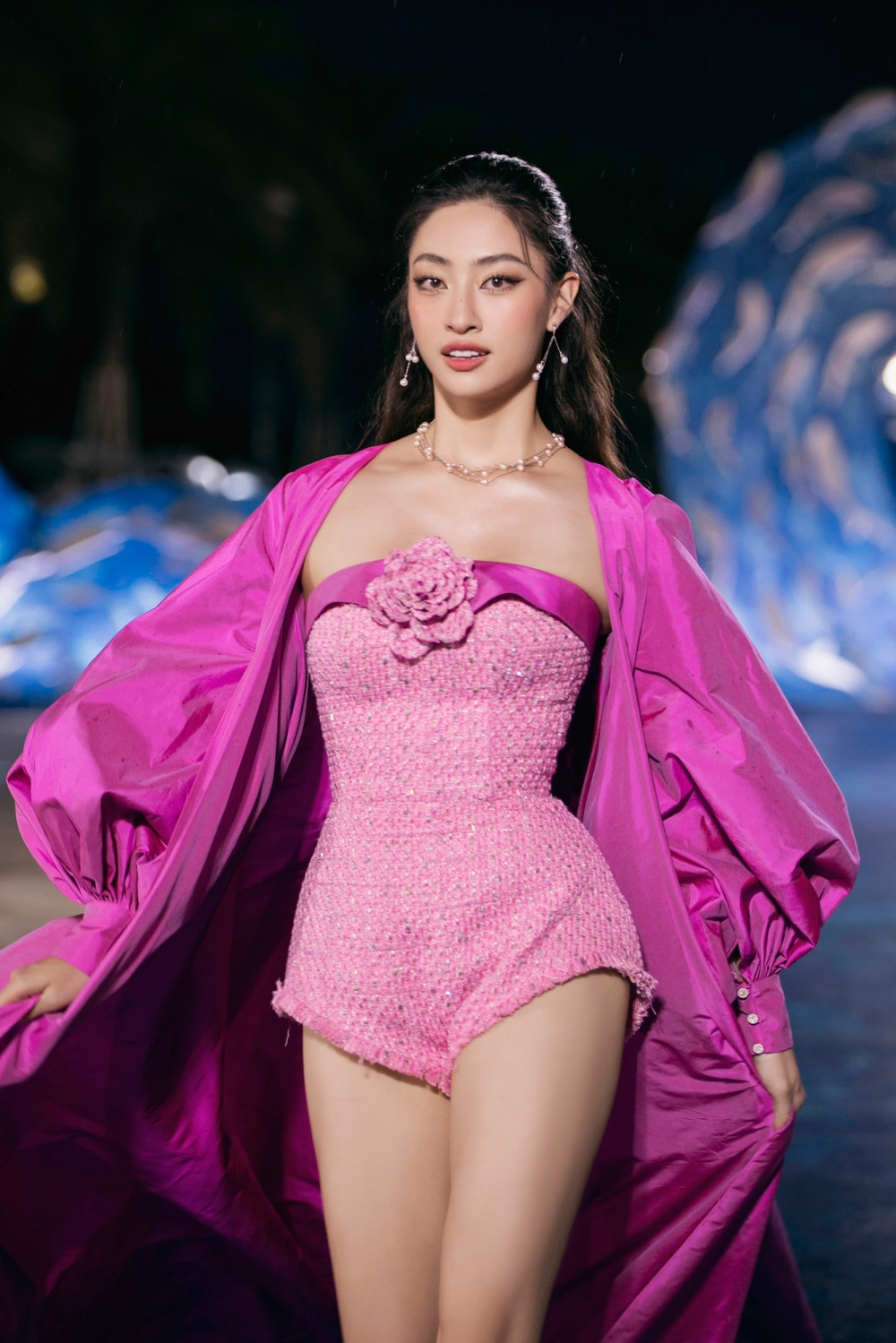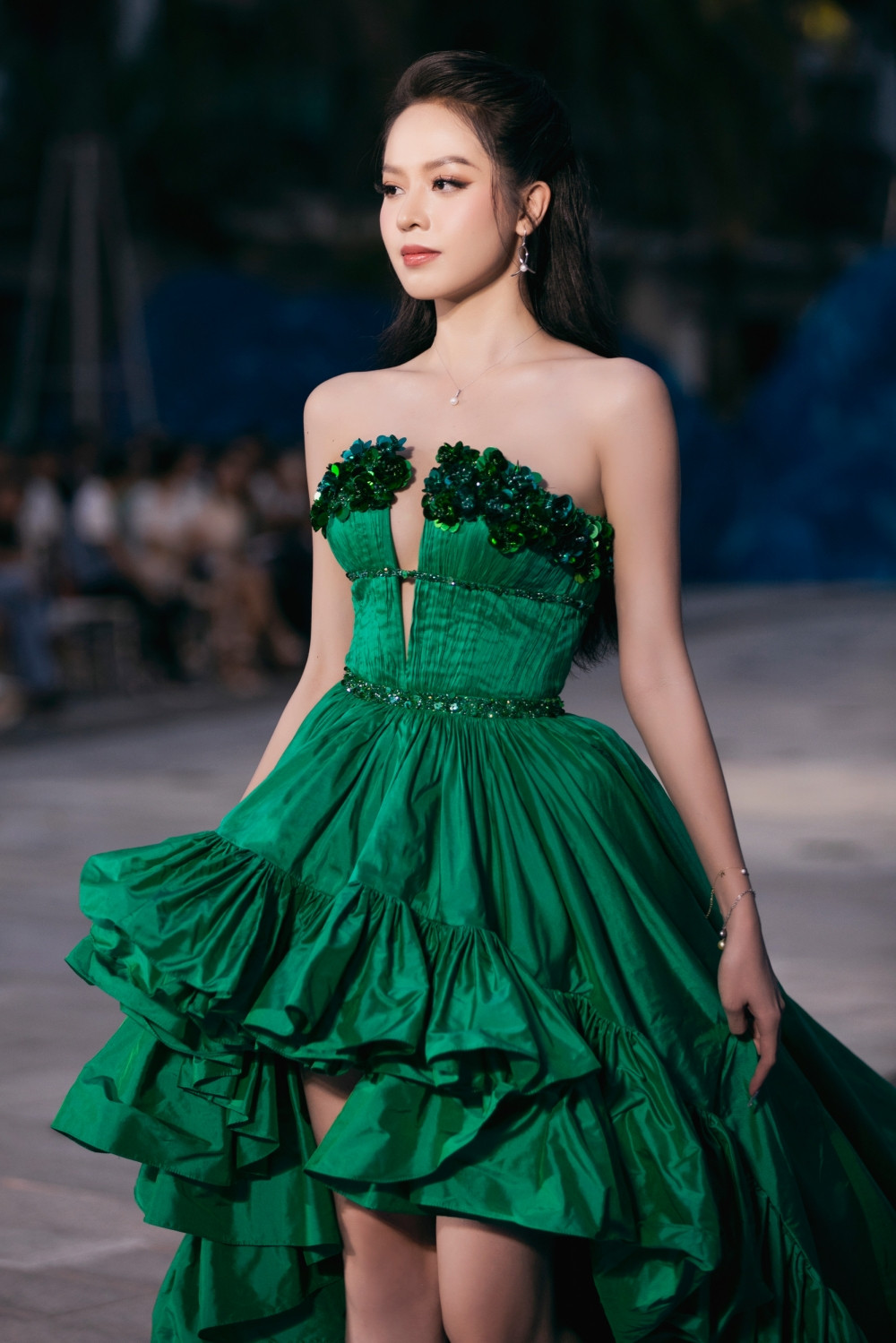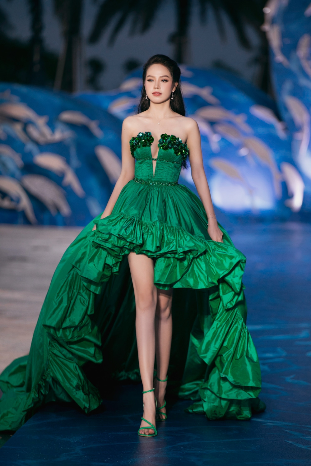 Vedette Lương Thùy Linh kết show bằng một thiết kế gói trọn các điểm nhấn nổi bật của bộ sưu tập: Trẻ trung, cuốn hút, sang trọng và ngập tràn sự tự tin.