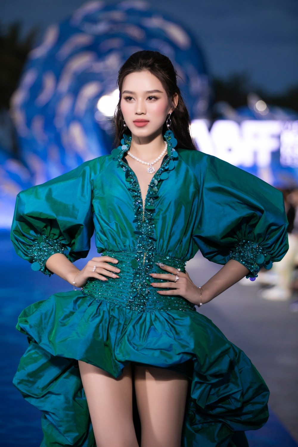 Trong vị trí first face, Hoa hậu Đỗ Thị Hà và Hoa hậu Thanh Thủy thể hiện mẫu thiết kế có phom dáng tương tự nhưng lại mang hai phong cách khác nhau.