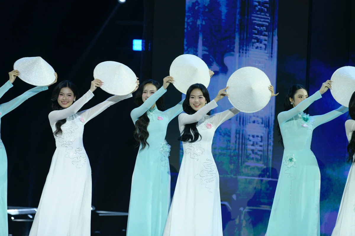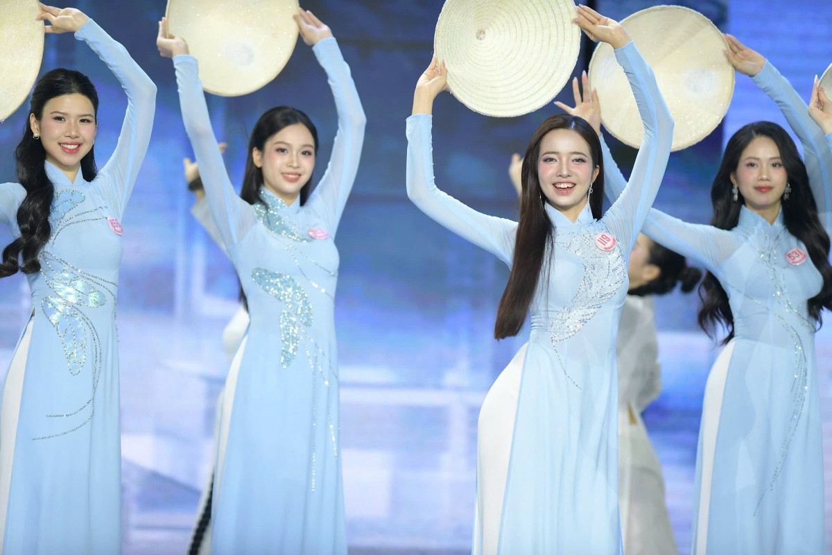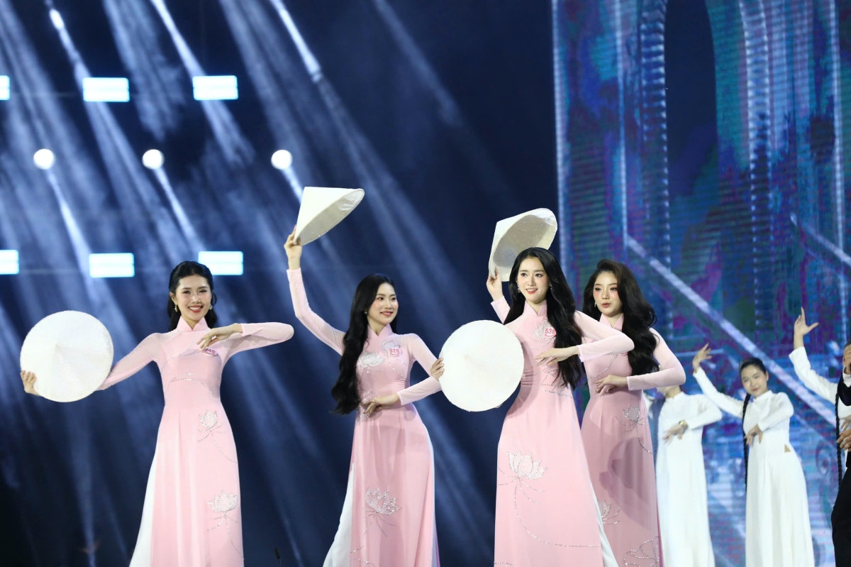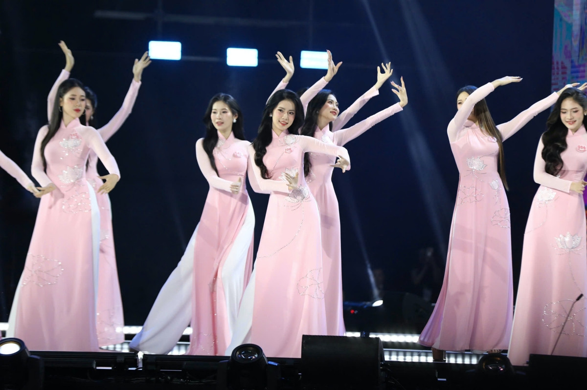 Nhan sắc rạng rỡ, xinh đẹp tự nhiên của Top 41 thí sinh Hoa hậu Việt Nam 2024 trong màn trình diễn áo dài, trên nền ca khúc Việt Nam Hào Quang Rực Sáng, với giọng ca của hai nữ ca sĩ Satila Hồng Vịnh và Lưu Hiền Trinh.