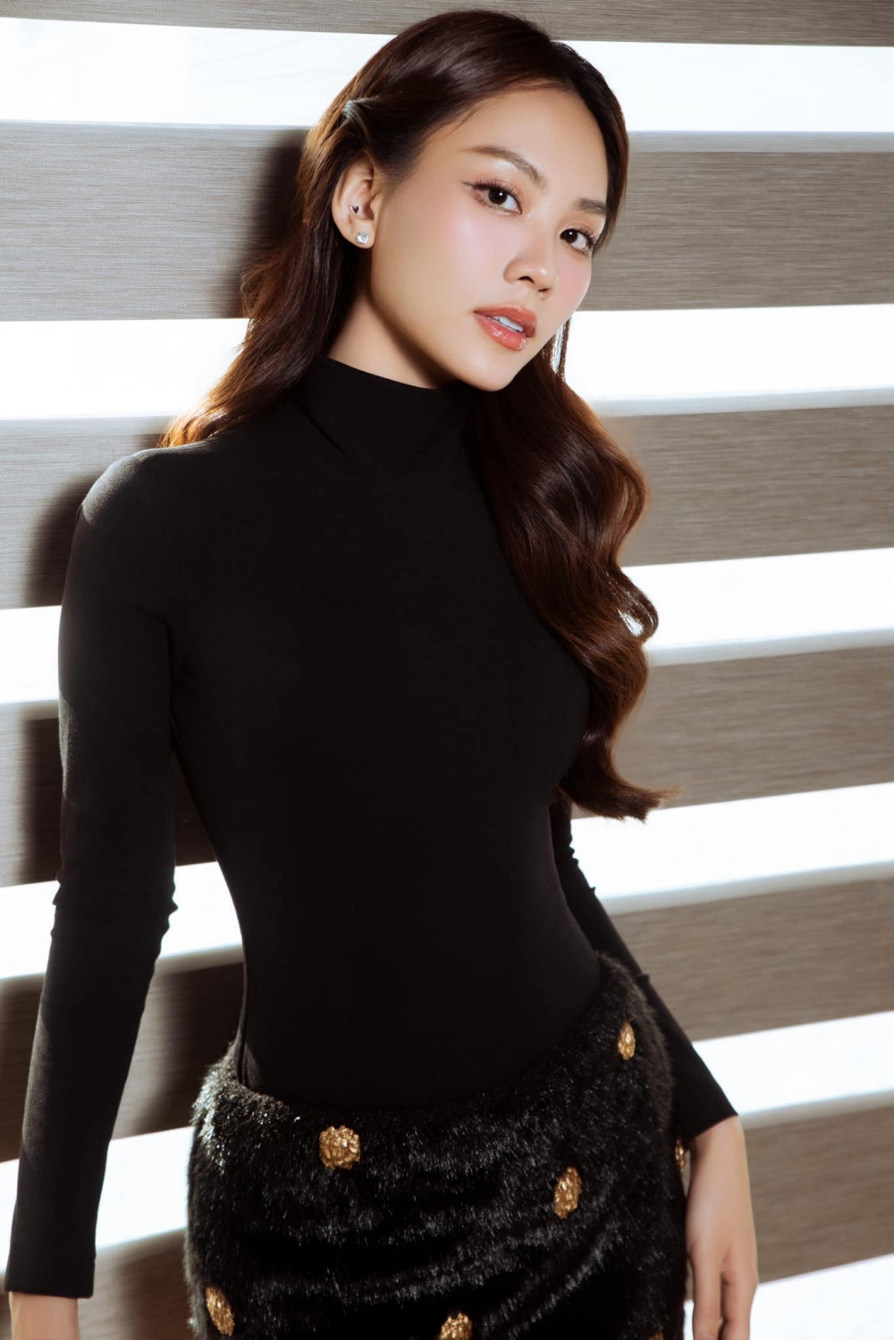 Mẫu váy này thuộc về một thương hiệu Việt, rất hay được dàn Hoa - Á hậu Việt chọn mặc vì kiểu dáng đơn giản mà sang trọng. Set đồ có tên Jade Mini Set với chân váy miniskirt được tạo điểm nhấn đặc biệt khi kết hợp giữa chất lông và cúc đồng lạ mắt, phối hợp cùng turtle-neck bodysuit.