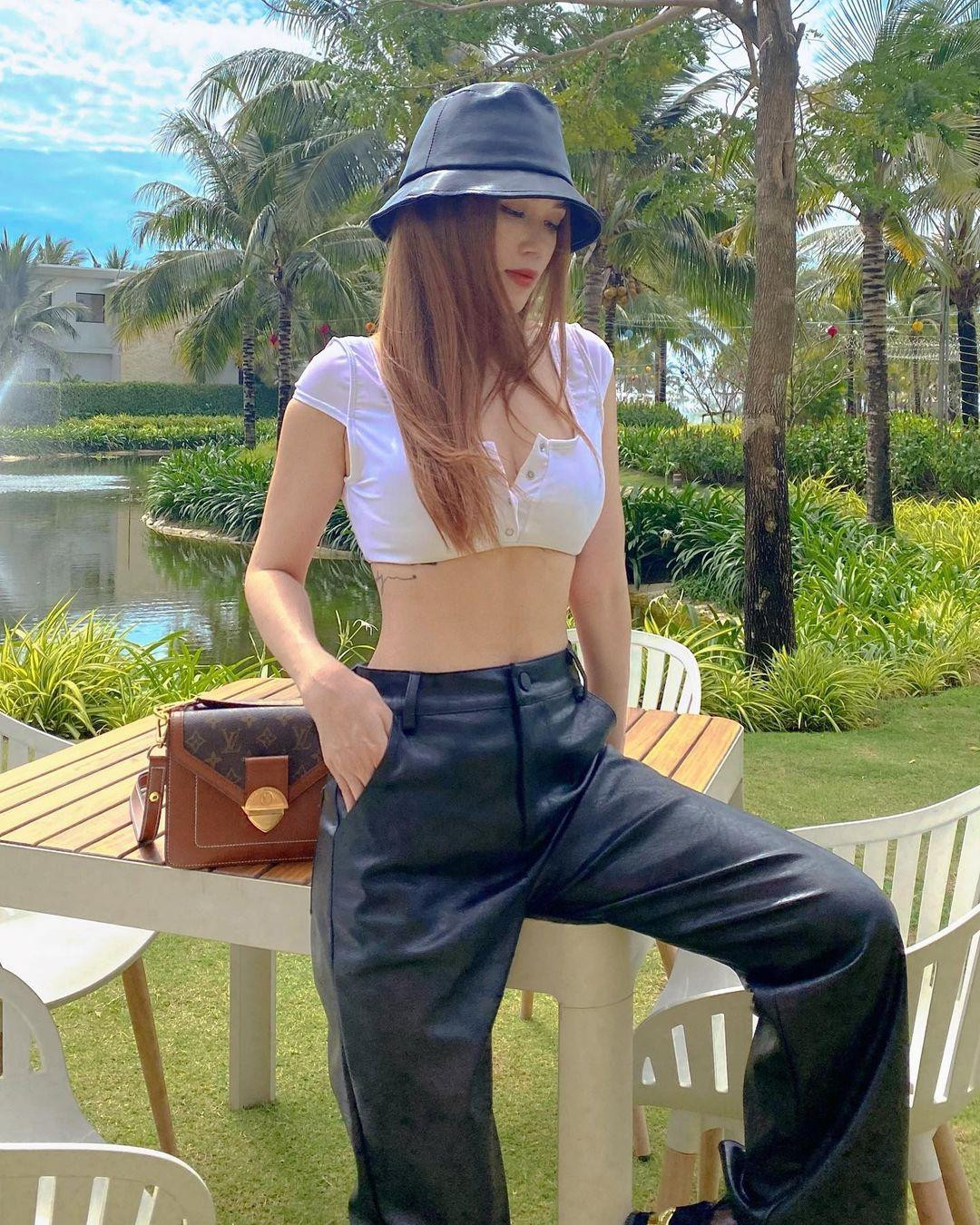 Sĩ Thanh chăm chỉ khoe eo thon với áo crop-top siêu ngắn, phối cùng quần da và mũ bucket tone-sur-tone.