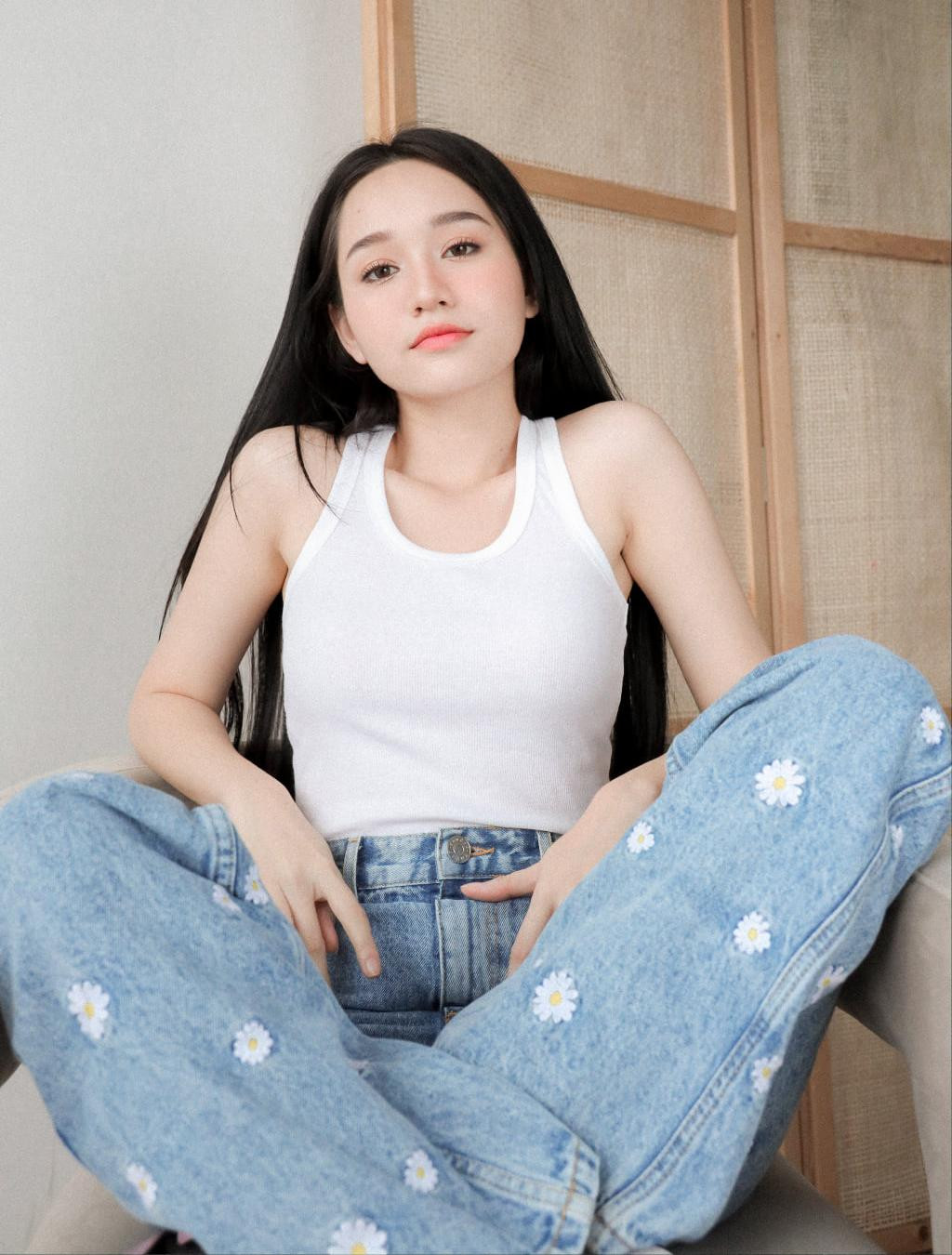 Trúc Anh mix đồ đơn giản mà vẫn xinh với áo tank top phối cùng quần jeans ống rộng họa tiết hoa cúc, vừa năng động, vừa thời trang.