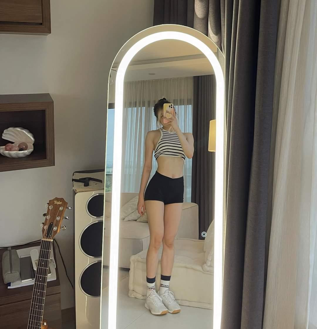 Thiều Bảo Trâm gia nhập hội “toàn chân” với áo tank-top kẻ sọc cùng quần tập gym ôm sát, đi giày sneaker năng động.