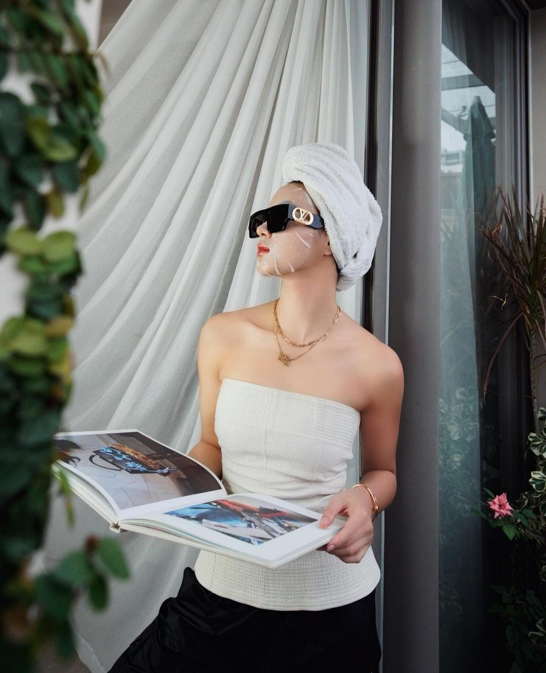 Châu Bùi skincare mà vẫn high fashion với áo quây màu trắng cùng trang sức lấp lánh và mắt kính LV thời trang.