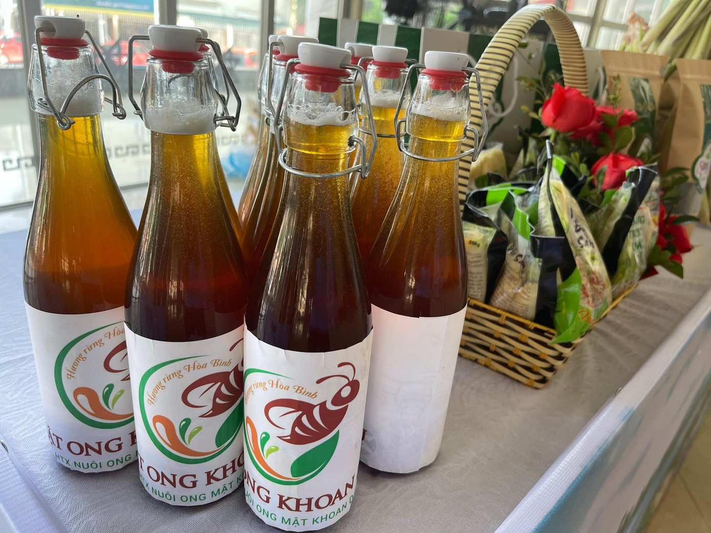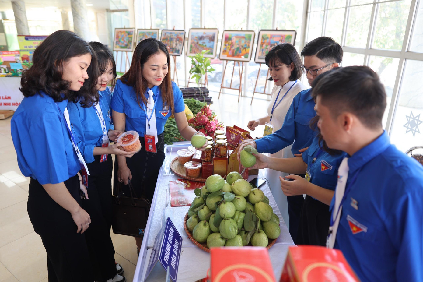 TPO - Ngay trước sảnh Trung tâm Văn hóa Hòa Bình, nơi diễn ra Đại hội đại biểu Đoàn TNCS Hồ Chí Minh tỉnh Hòa Bình lần thứ XVII, nhiệm kỳ 2022 – 2027, các sản phẩm nông sản đặc trưng của Hòa Bình, như: cam Cao Phong, măng, trà shan tuyết Pà Cò… thổ cẩm được trưng bày đầy ấn tượng.