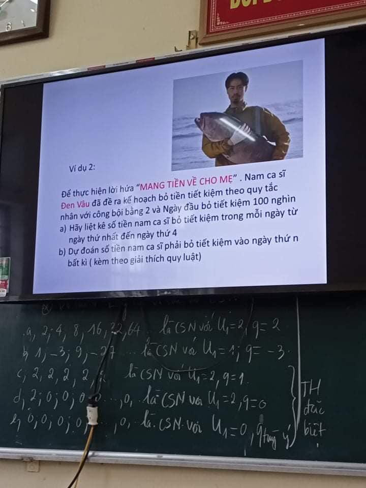 Mới đây, Mang tiền về cho mẹ của Đen Vâu lại xuất hiện trong một bài tập Toán khiến dân mạng vô cùng thích thú. Cụ thể, đề Toán sử dụng hình ảnh minh họa Đen Vâu ôm chú cá ở cuối MV kèm câu hỏi: