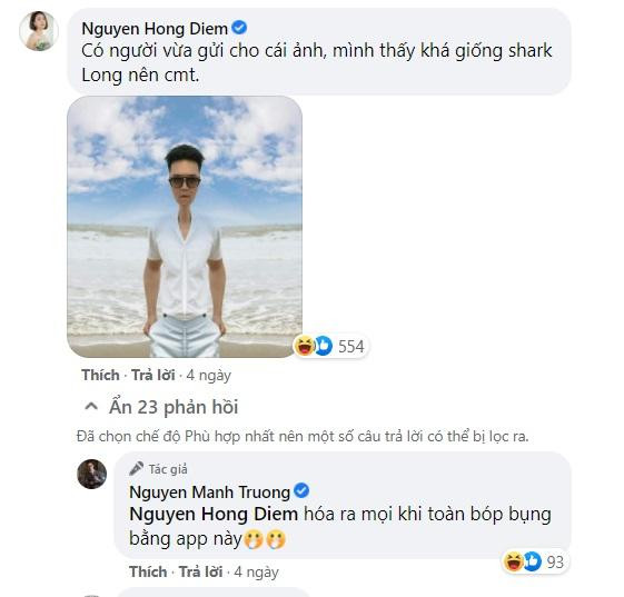 Đặc biệt, người hâm mộ còn dành sự chú ý tới cuộc trò chuyện dí dỏm của Mạnh Trường và Hồng Diễm dưới bình luận. Nhìn thấy Mạnh Trường tung ảnh, Hồng Diễm đặc biệt gửi tặng anh bức hình cùng dòng nhắn: “Có người vừa gửi cho cái ảnh, mình thấy khá giống shark Long nên bình luận.”
