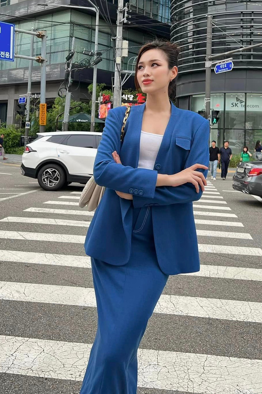 Cũng có lúc, Đỗ Thị Hà mặc nguyên set váy suông cùng bộ với áo blazer, nhìn đầy sang trọng, nữ tính. Nàng hậu còn mạnh dạn xỏ chân vào một đôi giày sneaker chứ không phải giày cao gót, tạo thành tổng thể đầy trẻ trung.
