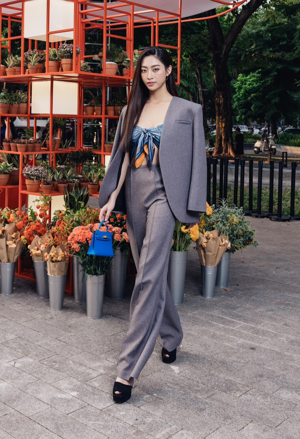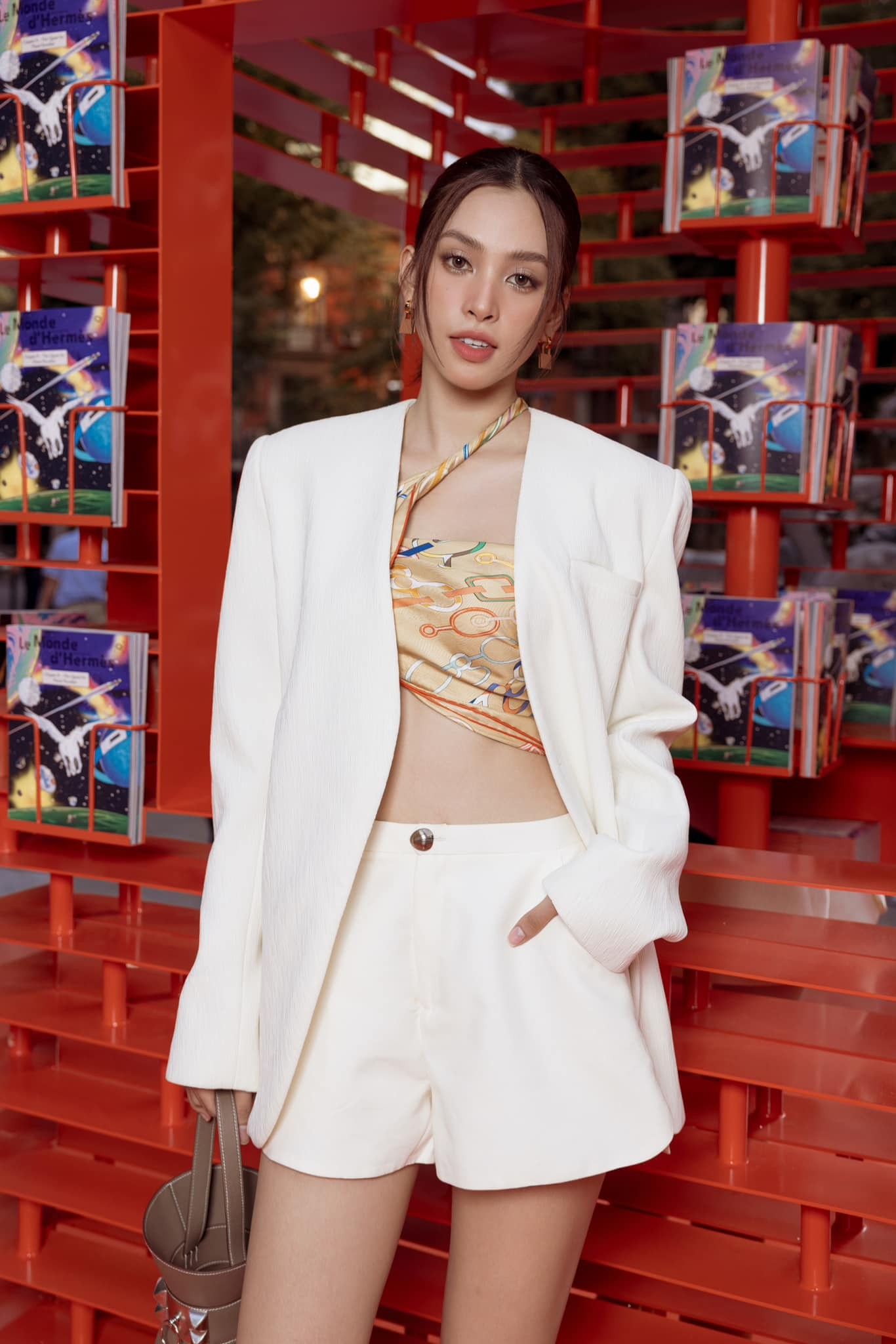 Hoa hậu Tiểu Vy cũng có cách phối đồ tương tự như Lương Thùy Linh. Nhờ blazer khoác ngoài mà Tiểu Vy nhìn kín đáo, thanh lịch hơn hẳn dù nàng hậu đang mặc crop-top siêu bé, khoe được vòng eo săn chắc.