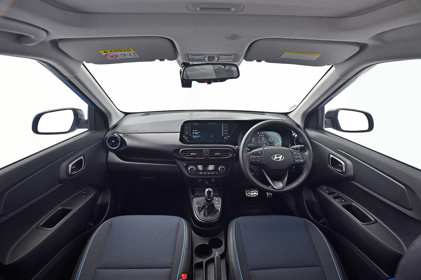 Ở khoang nội thất, Hyundai Exter sử dụng vô-lăng 3 chấu tích hợp phím chỉnh âm lượng, cụm đồng hồ kỹ thuật số 4,2 inch tùy chỉnh 12 ngôn ngữ, màn hình cảm ứng 8 inch hỗ trợ Android Auto/Apple CarPlay, điều hòa tự động, cửa sổ trời chỉnh điện, sạc không dây, sạc USB-C.