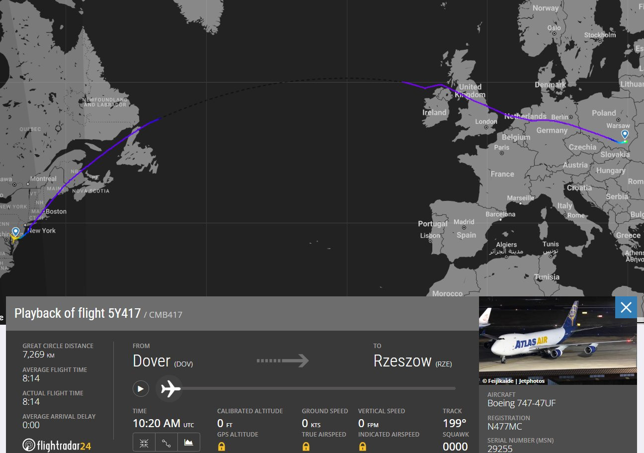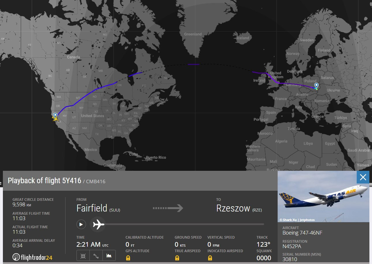 Theo thông tin từ OSINT, trong những ngày gần đây, 8 máy bay chở hàng Boeing 747 đã được ghi nhận cất cánh từ 5 căn cứ quân sự của Mỹ và hạ cánh xuống sân bay Rzeszow-Jasionka ở Ba Lan - trung tâm hậu cần quan trọng cho việc viện trợ của phương Tây dành cho Ukraine kể từ khi xung đột Nga - Ukraine nổ ra.