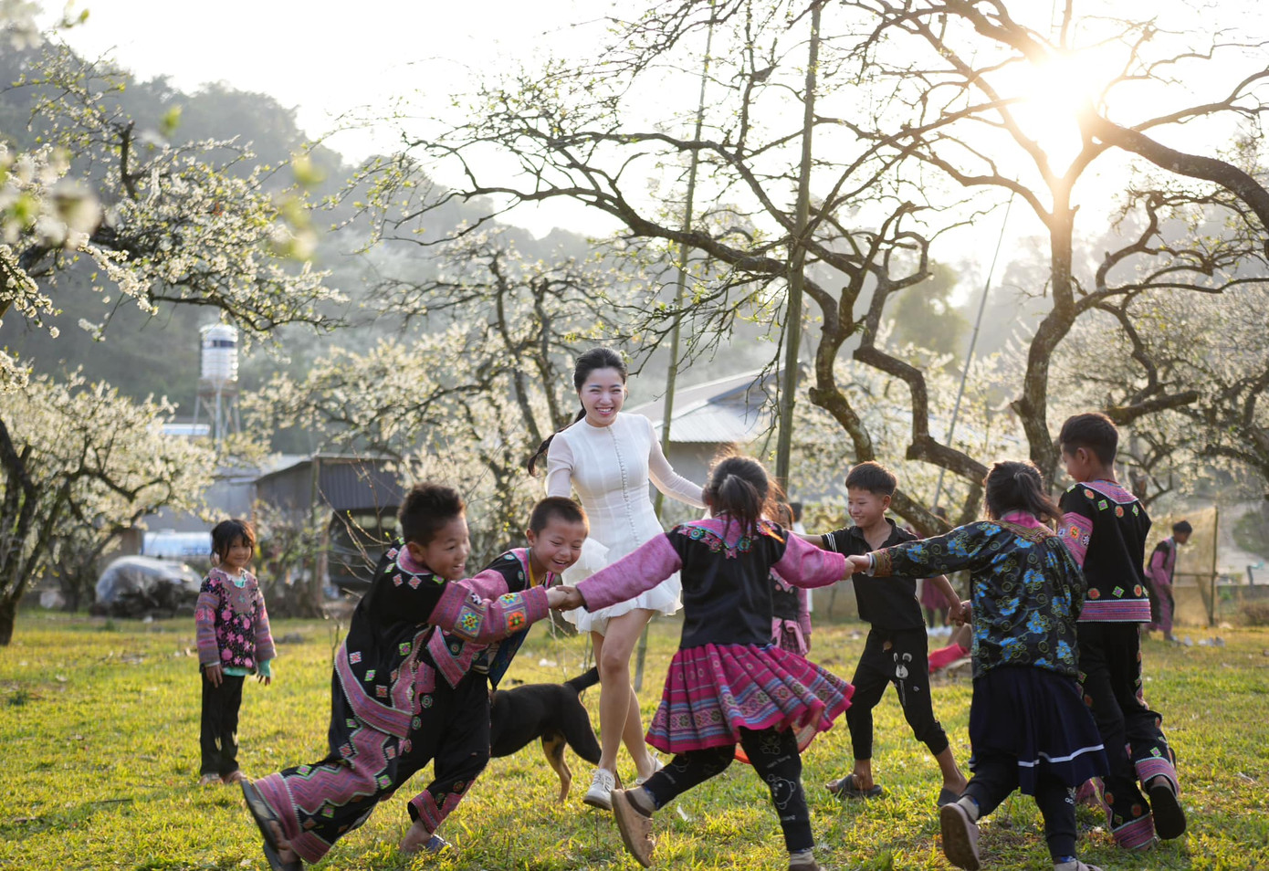 | MC Đồng Thu khoe sắc giữa mùa hoa mận Mộc Châu. |