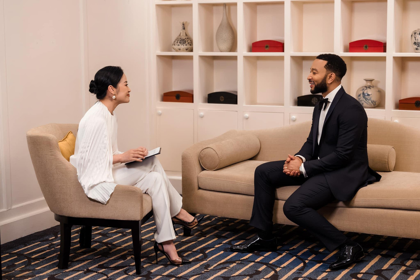 Kết thúc buổi phỏng vấn thành công, Phí Linh bồi hồi cho hay: "Đầu tôi đang ở dưới nước nhưng tôi đang thở ổn. Đó chính xác là cảm xúc của tôi khi tôi có cơ hội nói chuyện với một trong những nghệ sĩ tài năng nhất thời của chúng tôi. Vâng, một trong hai người trẻ nhất lịch sử có bộ sưu tập EGOT (nhóm những người đoạt cả 4 giải danh giá nhất của giới nghệ thuật, giải trí, gồm Grammy, Emmy, Oscar và Tony) - John Legend".