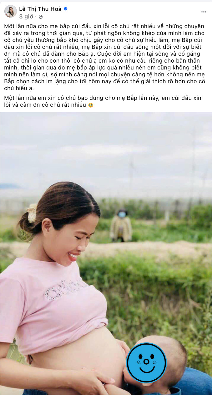 Sáng ngày 26/2, mẹ Bắp cũng đã có động thái chia sẻ trên trang cá nhân, tiếp tục gửi lời xin lỗi tới mọi người, tự nhận mình là người không khéo khiến những phát ngôn đưa ra gây hiểu lầm, khó chịu cho người nghe, người đọc. Đó cũng là lý do mà mẹ Bắp quyết định im lặng cho tới hôm nay mới giải thích, cầu xin sự bao dung của mọi người.