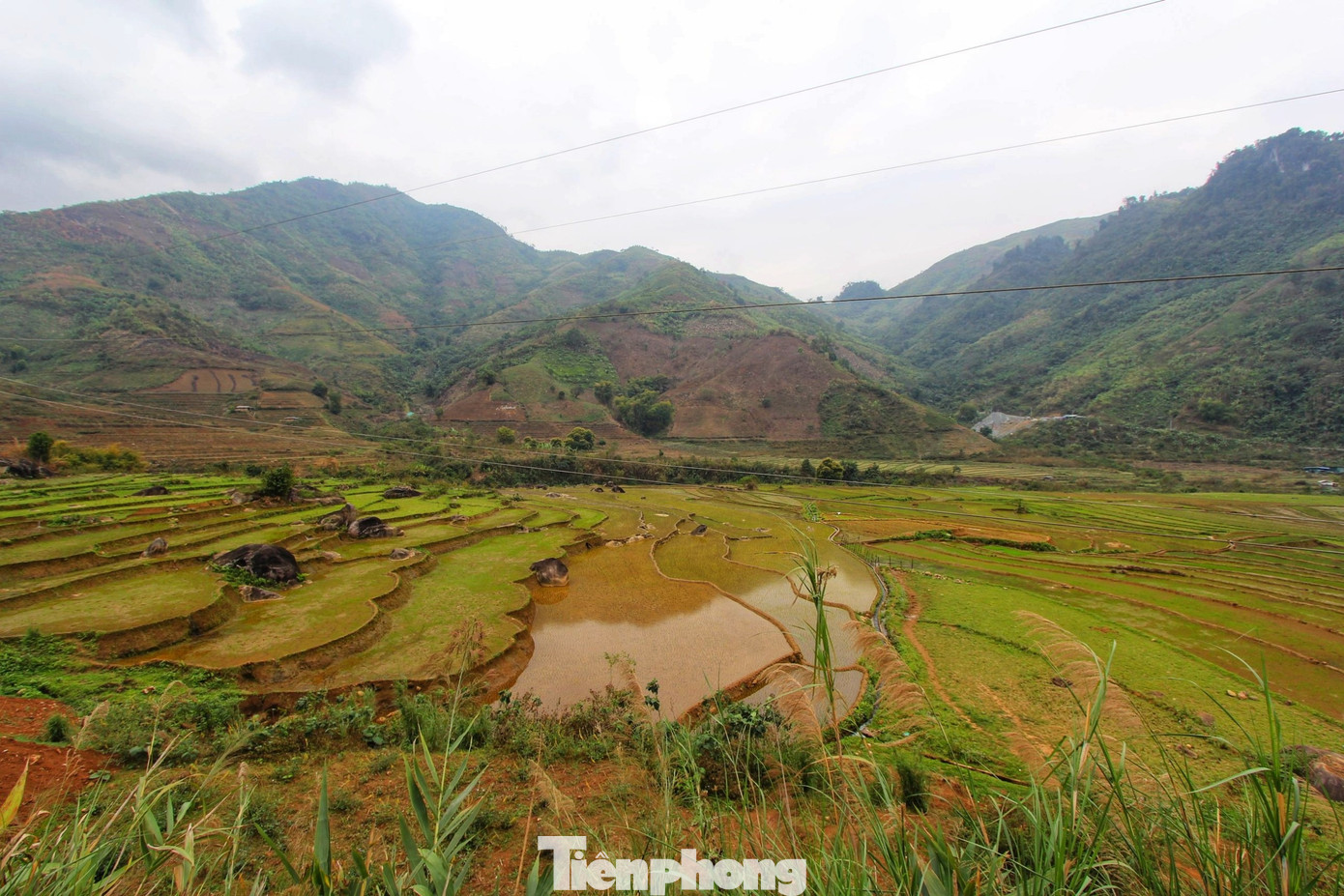 Tháng 3 ở Lai Châu còn có những cánh đồng ruộng bậc thang vừa cấy lúa xong. Và chỉ vài tháng sau, những cây lúa này sẽ cho ra loại gạo Séng Cù thơm ngon nức tiếng, giúp bà con có cuốc sống ấm no và hạnh phúc hơn. (Ảnh: Lộc Liên)