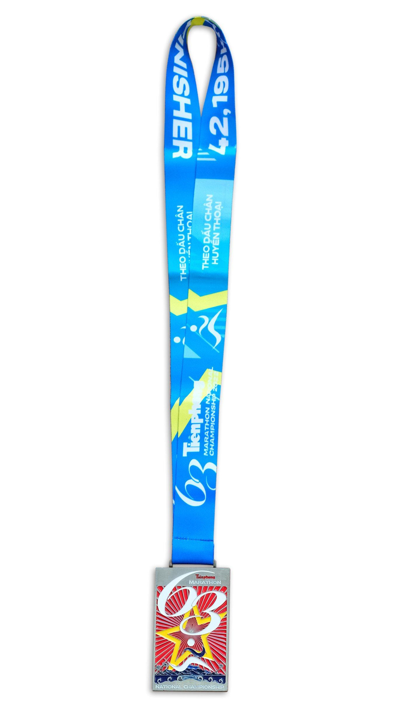 | Về đích tại Tiền Phong Marathon 2022, VĐV sẽ nhận huy chương giống nhau, chỉ khác về màu dây. VĐV 10 km nhận huy chương có dây màu xanh lá cây; 21 km là màu cam; 42 km là xanh nước biển. |