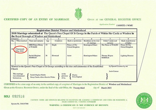 Tuy nhiên, tuyên bố của Meghan đã bị phủ nhận khi Tổng cục Đăng ký ở Anh lần đầu tiên tiết lộ giấy chứng nhận kết hôn của cặp đôi. Tờ giấy này chứng minh rằng họ kết hôn vào ngày 19/5/2018, tức là đúng ngày tổ chức hôn lễ hoành tráng ở Lâu đài Windsor, chứ không phải 3 ngày trước đó.