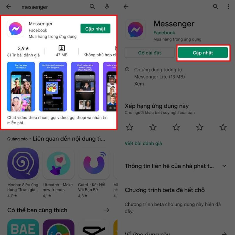 Bước 1: Bạn cần cập nhật Messenger trên điện thoại của bạn lên phiên bản mới nhất nhé. Hãy vào CH Play hay App Store để có thể kiểm tra hoặc bấm vào đường link bên dưới để kiểm tra ngay.