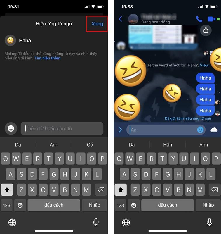 Bước 4: Bạn và mọi người sẽ thấy hiệu ứng từ ngữ mà mình vừa đặt, nhấn Xong. Giờ đây, khi nhắn tin với những cụm từ này sẽ xuất hiện các icon bay lên như bong bóng rất thú vị.