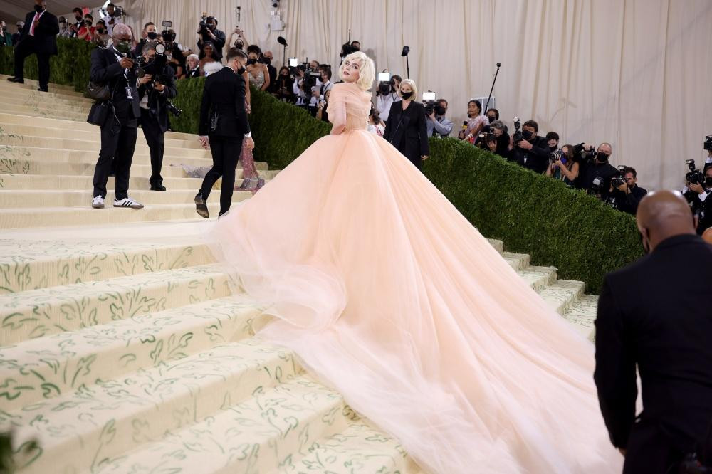 Trái ngược hoàn toàn với sự xuất hiện có phần xuề xòa tại thảm đỏ VMAs hôm qua, ca sĩ Billie Eilish (một trong 4 vị host) cực kỳ nữ tính, xinh đẹp như minh tinh Marilyn Monroe trong bộ váy siêu to khổng lồ của nhà mốt Oscar de la Renta.