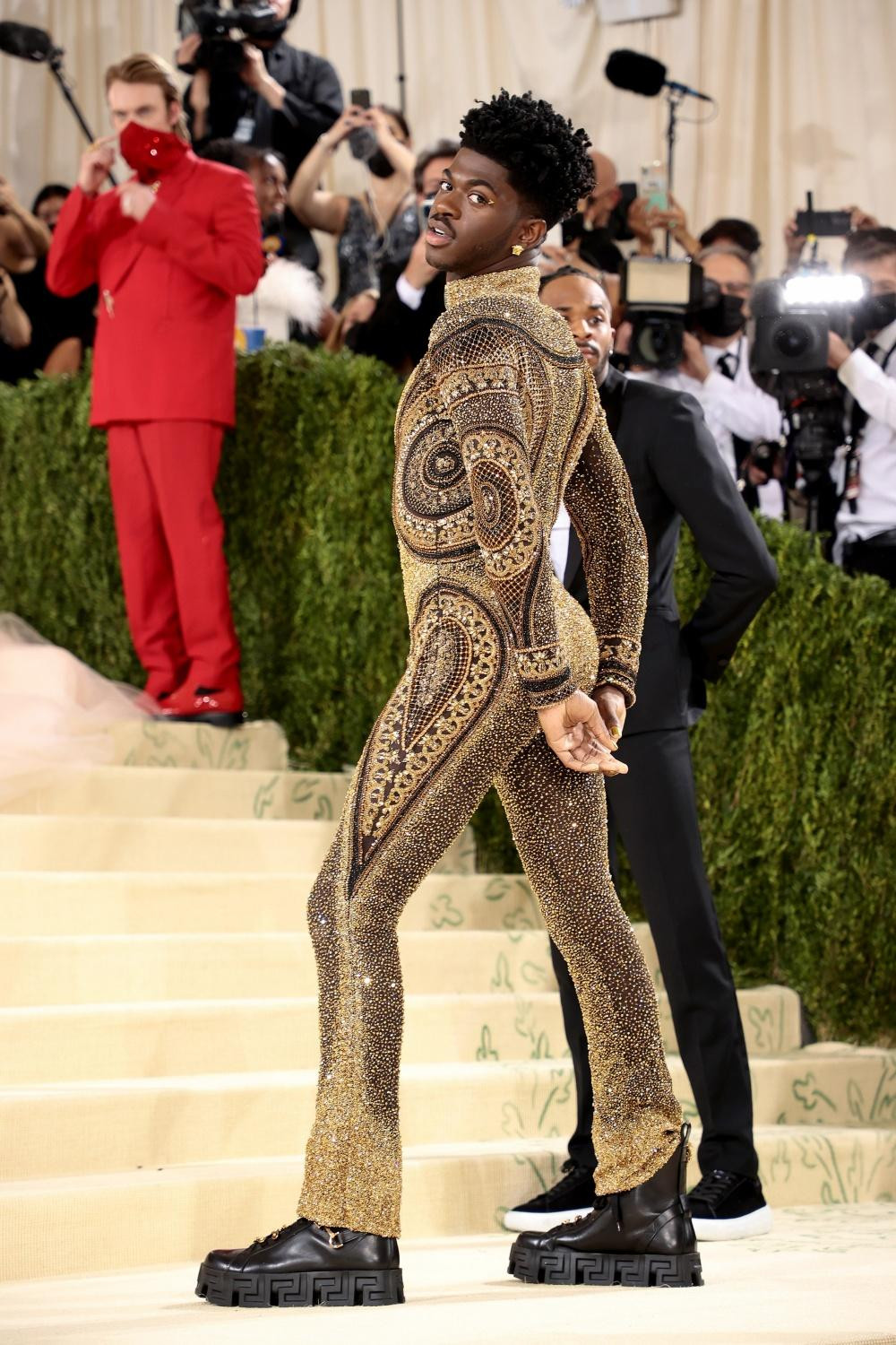 Lil Nax X và màn xuất hiện vô cùng cồng kềnh trong thiết kế của Versace. Anh tháo dần các lớp trang phục, và cuối cùng “chốt” lại trong bộ bodysuit với họa tiết cực đẹp, xứng danh nhân vật "gây bão" thảm đỏ Met Gala 2021.