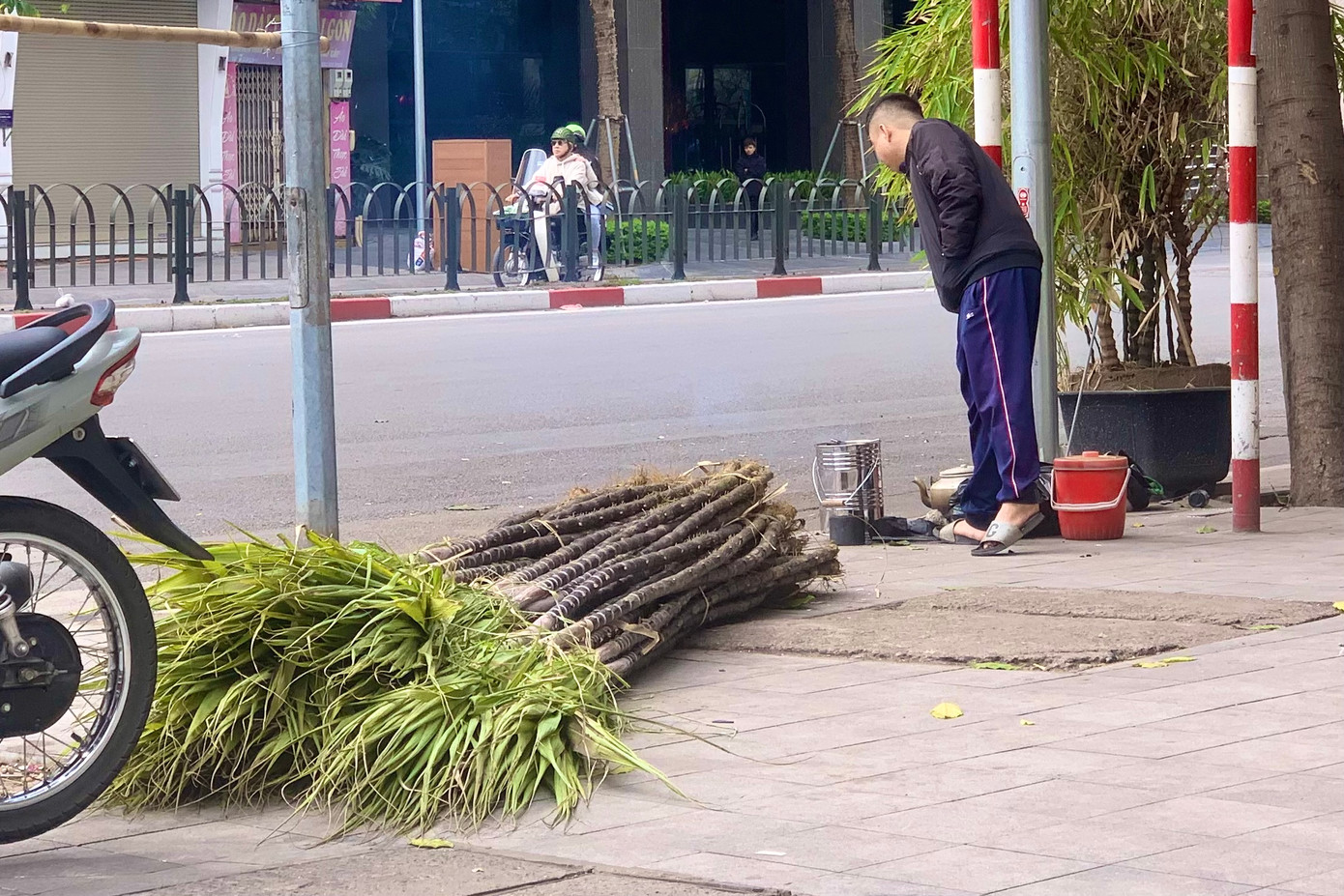 Hàng trăm cây mía lộc được tiểu thương tập kết trên phố Tôn Đức Thắng.