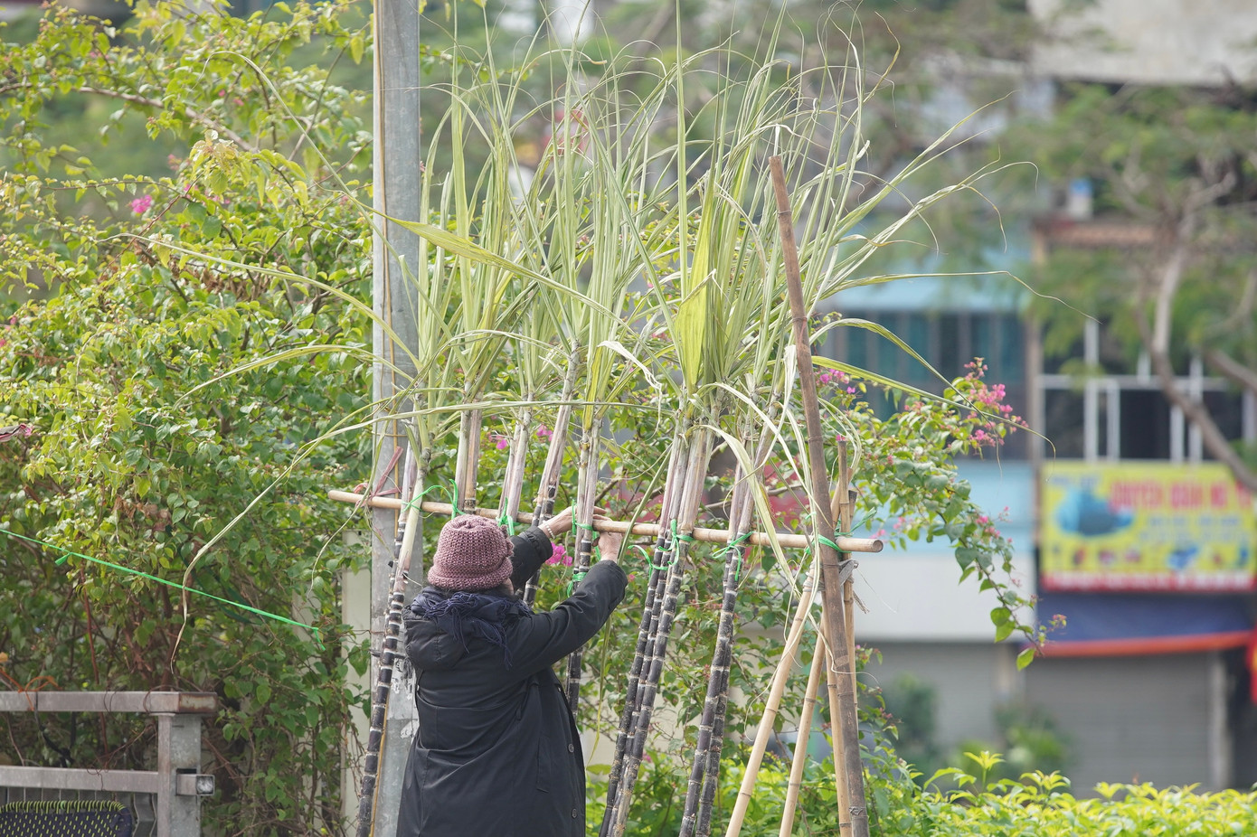 Một tiểu thương chuẩn bị những cặp mía lộc để bán trên phố Hồ Đắc Di (Đống Đa). Tiểu thương này cho biết, đã chuẩn bị khoảng 100 cây mía để bán sau khoảnh khắc giao thừa.