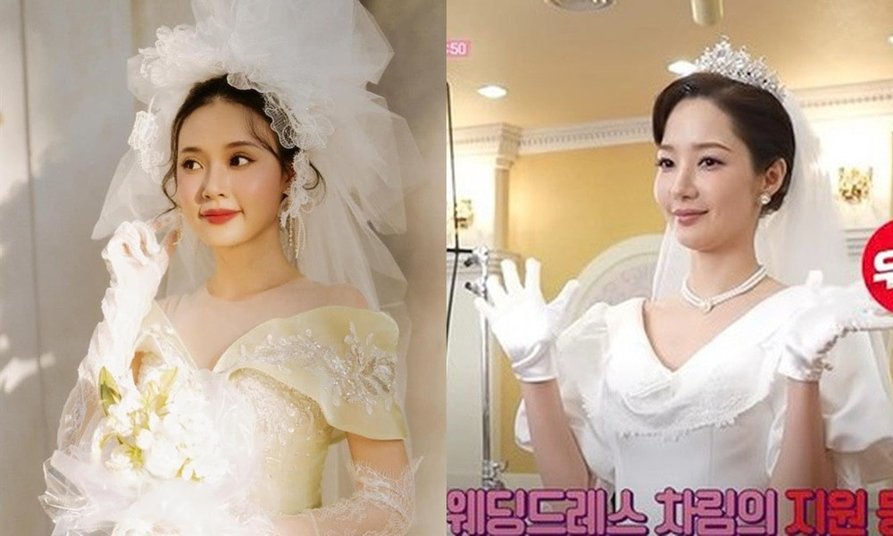 Trong loạt ảnh cưới, Midu chọn váy cưới đậm phong cách thập niên 1970, voan cài đầu cũng nhiều lớp bồng bềnh khác hẳn với xu hướng voan nhỏ xinh như hiện tại. Bộ váy cưới của Midu khiến nhiều netizen liên tưởng đến phim Cô Đi Mà Lấy Chồng Tôi, khi nữ chính cũng mặc váy cưới cổ điển và sau đó làm bùng nổ trào lưu diện váy cưới như thời bố mẹ.