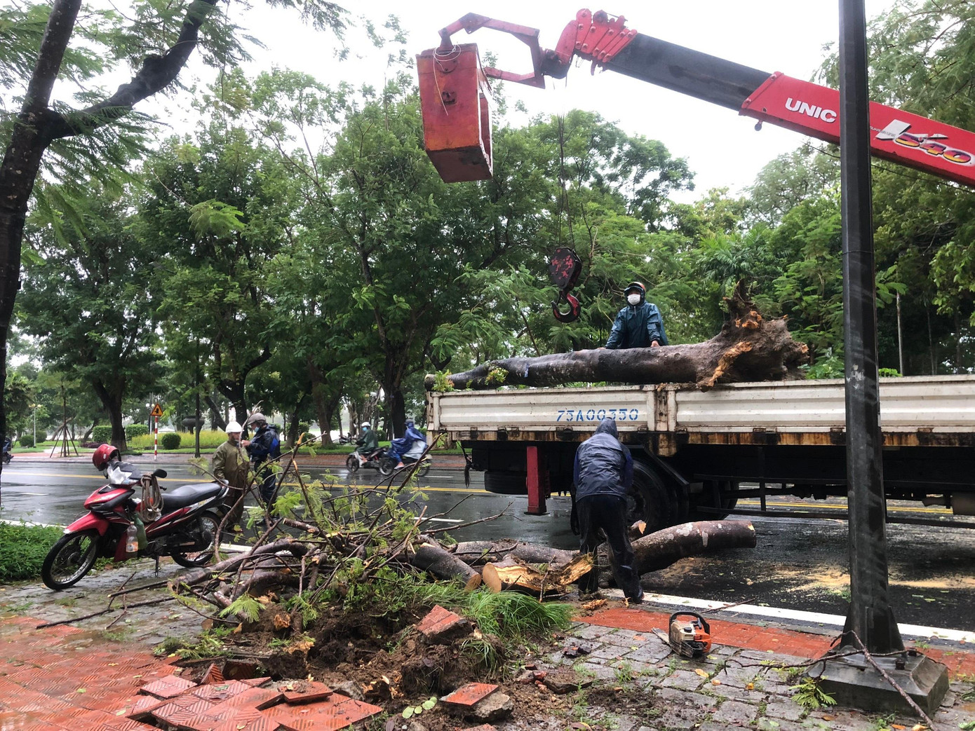 | Thu dọn cây xanh đổ ngã trên đường phố Huế do gió to, mưa lớn |
