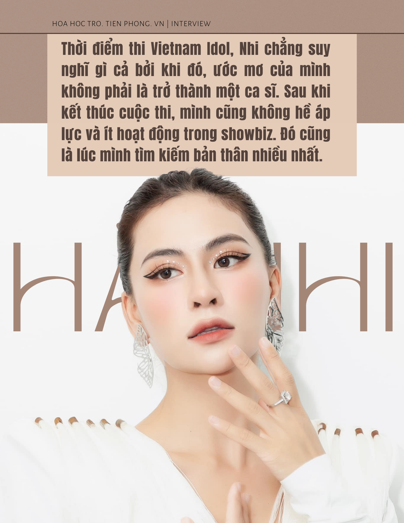“Thời điểm thi Vietnam Idol, Nhi chẳng suy nghĩ gì cả bởi khi đó, ước mơ của mình không phải là trở thành một ca sĩ. Sau khi kết thúc cuộc thi, mình cũng không hề áp lực và ít hoạt động trong showbiz. Đó cũng là lúc mình tìm kiếm bản thân nhiều nhất. Mình thử làm một công việc văn phòng với mức lương 7 - 8 triệu đồng/ tháng, và rồi sau đó nhận ra bản thân chẳng được tự do như mình mong muốn”.