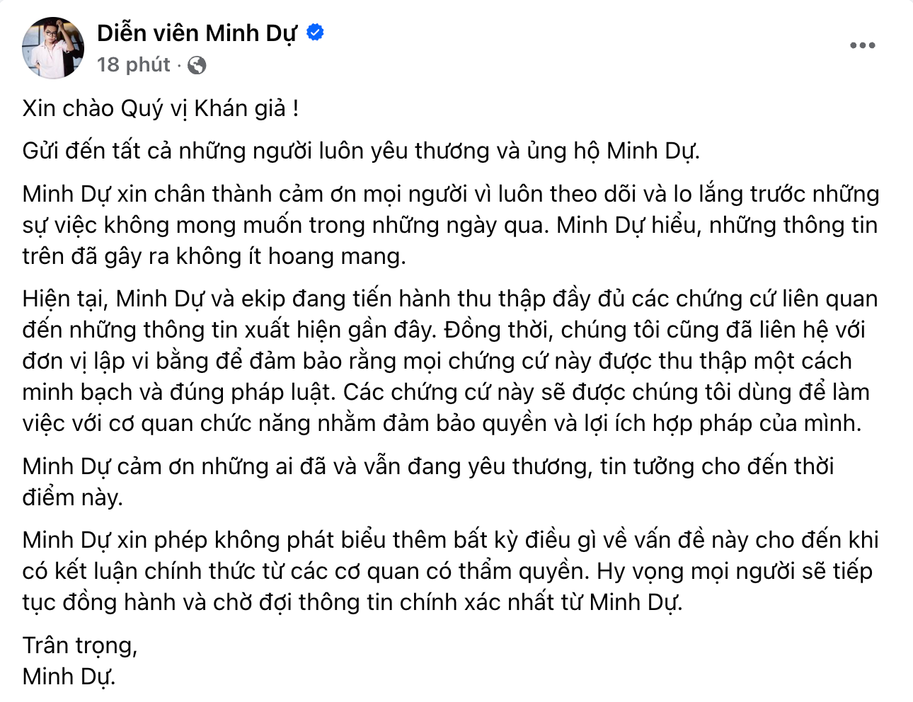 Nam diễn viên chia sẻ thêm, hành động lập vi bằng của mình hoàn toàn không xuất phát từ cảm xúc lo lắng hay sợ hãi. Đối với Minh Dự, đây là động thái cần thiết để bảo vệ bản thân và gia đình, khi trong suốt thời gian qua, anh liên tục nhận về nhiều chỉ trích, phê phán vô căn cứ từ cộng đồng mạng.