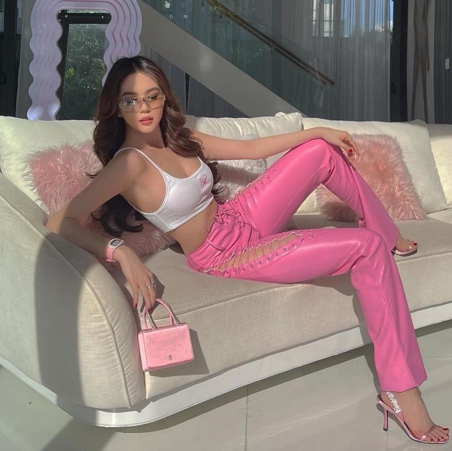 Ngọc Trinh khiến mọi người trầm trồ với trang phục đậm phong cách thời trang Y2K, người đẹp mặc áo hai dây crop-top màu trắng mix cùng quần da màu hồng có thiết kế đan dây độc đáo.