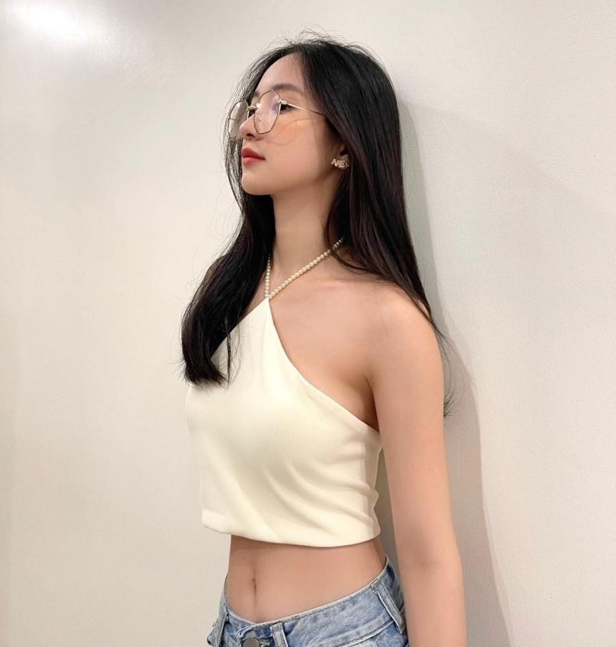 Jun Vũ khoe vòng 2 nhỏ xíu với áo cổ yếm màu trắng mix cùng quần jeans, đơn giản mà cực xinh.