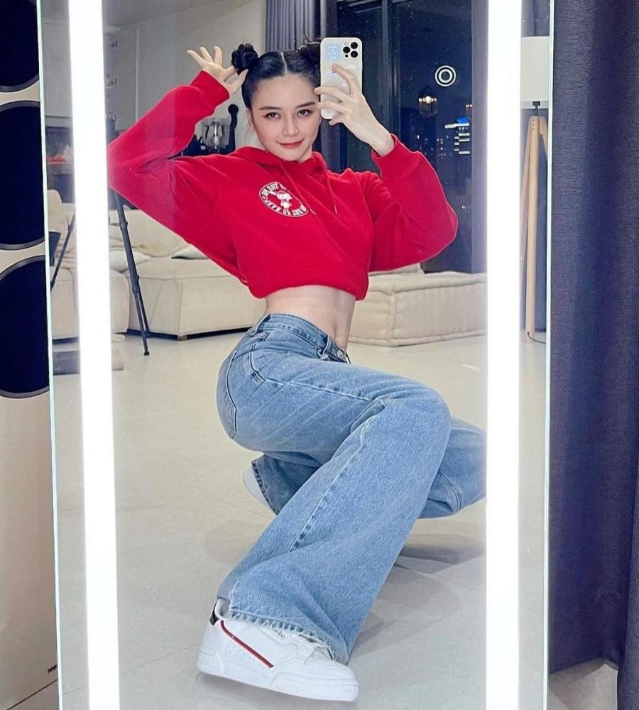 Thiều Bảo Trang mặc áo hoodie crop-top, mix cùng quần jeans ống rộng thời trang.