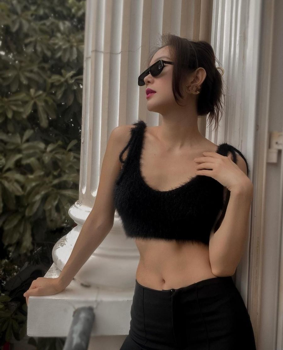 Minh Hằng chọn áo crop-top chất liệu len lông thỏ màu đen độc đáo, khéo léo khoe vòng eo săn chắc nhờ chăm chỉ luyện tập.