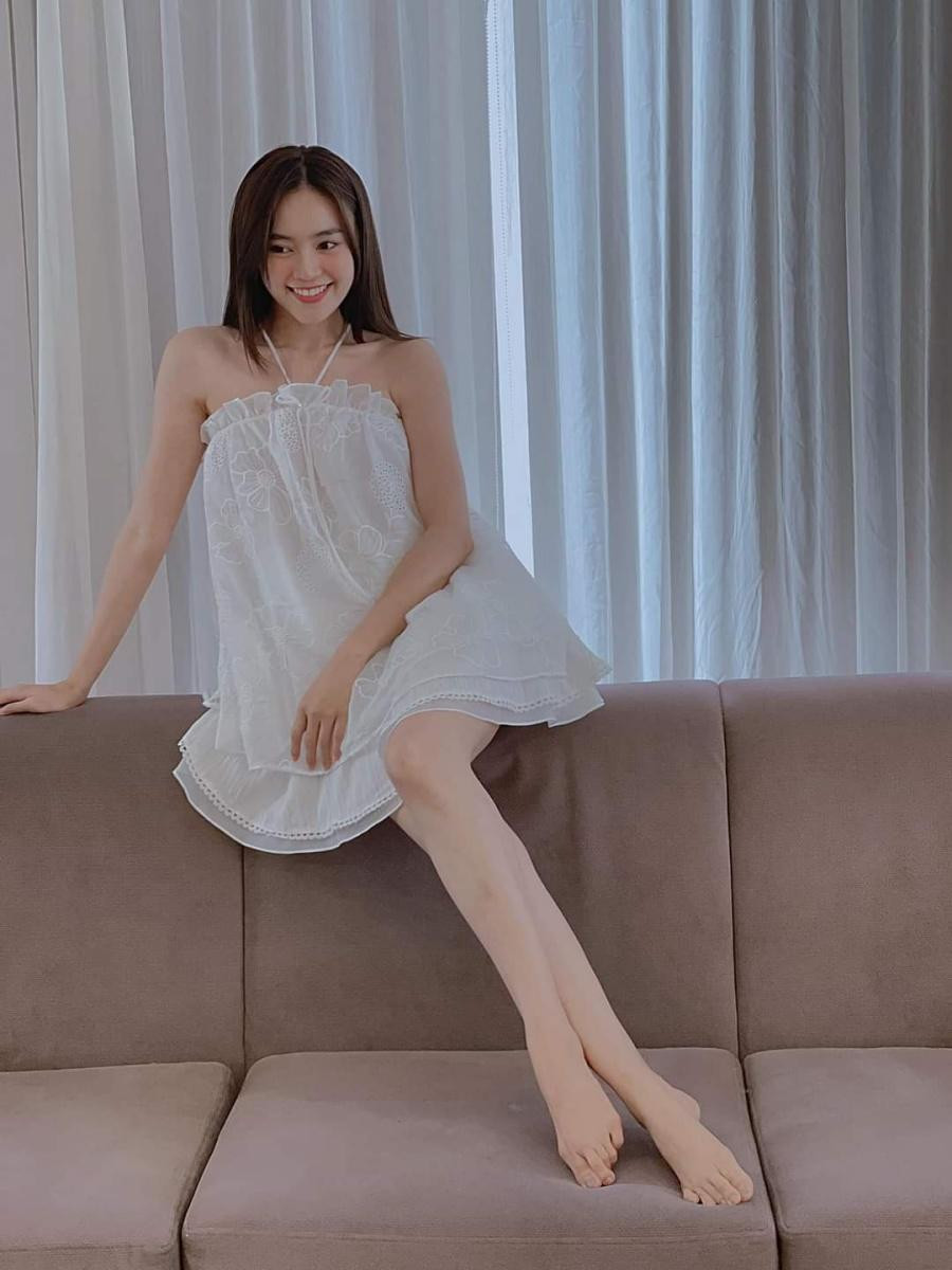 Ninh Dương Lan Ngọc ở nhà vẫn xinh với váy cổ yếm màu trắng rộng rãi, thoải mái vận động.