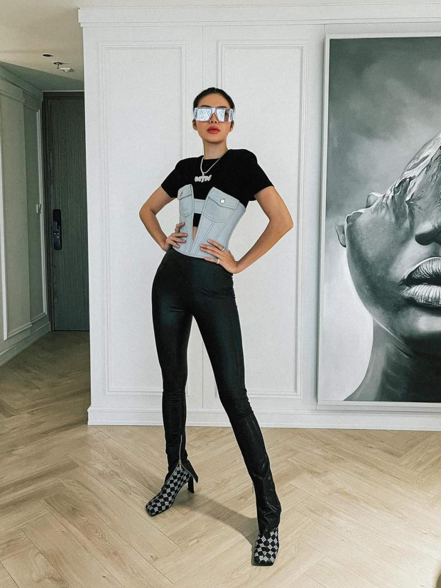 Minh Tú phối đồ ở nhà xịn xò như ra phố với áo crop-top, áo corset denim và quần legging da bóng.