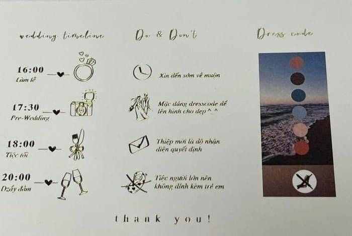 Ngoài ra, Minh Hằng cũng có nhiều quy định cho các khách mời dự tiệc. Ngoài bảng màu sắc để khách mời chuẩn bị trang phục thì Minh Hằng còn mong mỏi khách mời không mang theo trẻ em, mặc đúng theo yêu cầu và quan trọng nhất là không đi giày cao gót.