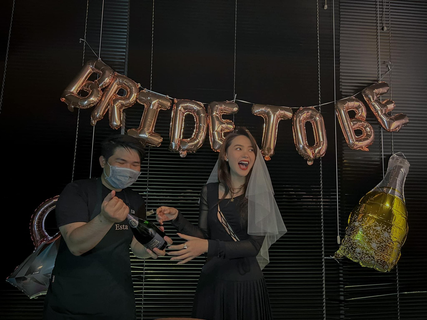 Ngoài ra, mỹ nhân 34 tuổi còn giải thích lý do diện váy đen trong tiệc độc thân: "Mấy chị em gái tổ chức tiệc độc thân bất ngờ nên cô dâu cứ hồn nhiên đen nguyên con đeo lúp. Xin tạm dưỡng sức chờ đến ngày big event chứ có một đêm mà tụi em rệu hết xương cốt rồi. Cảm ơn các chị em kinh nghiệm đã dẫn dắt em vào con đường hết độc thân trong vặn vẹo".