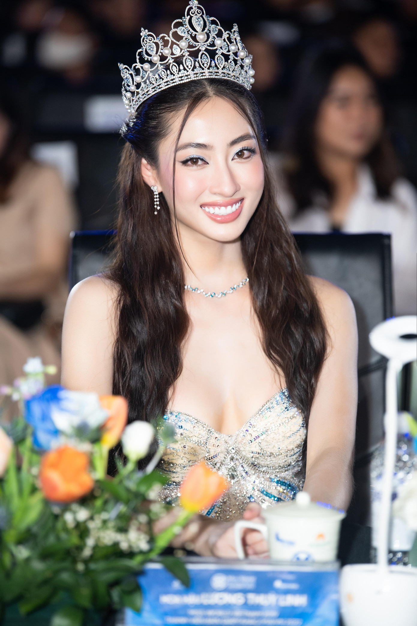 | Hoa hậu Lương Thuỳ Linh lộng lẫy trên ghế nóng. |