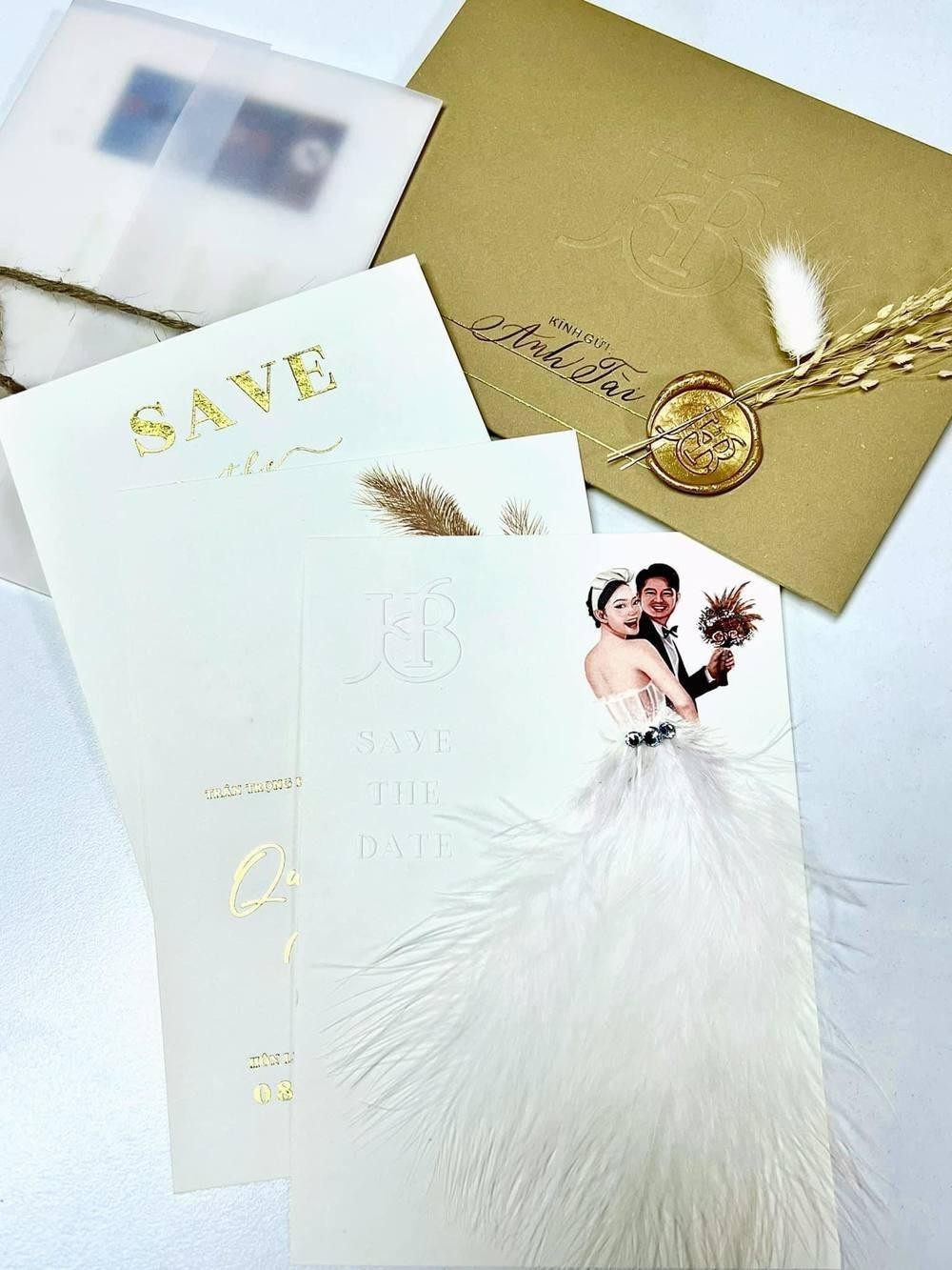 Cận kề hôn lễ, tấm thiệp cưới của nữ ca sĩ được hé lộ. Nữ ca sĩ sử dụng tông màu trắng - vàng và 3 trang giấy riêng biệt. Nổi bật trên thiệp là logo lồng ghép chữ H-B (tên của cô dâu và chú rể).