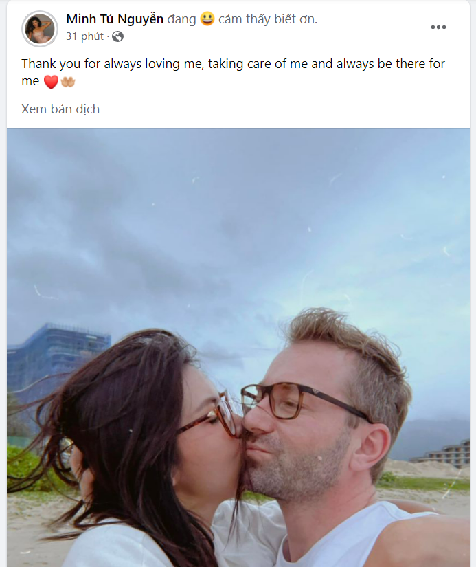 Mới đây, trên trang cá nhân của mình, siêu mẫu Minh Tú đã đăng ảnh tình tứ bên bạn trai với một dòng trạng thái cực ngọt, xóa tan mọi tin đồn chia tay. Cụ thể, nữ siêu mẫu bày tỏ cảm xúc biết ơn và chia sẻ: "Thank you for always loving me, taking care of me and always be there for me" (tạm dịch: Cảm ơn anh đã yêu, chăm sóc và luôn ở bên cạnh em).