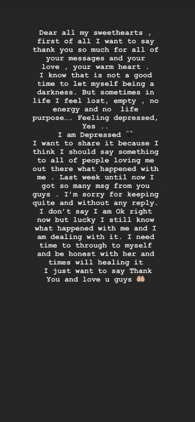 Không chỉ khiến người hâm mộ lo lắng vì chuyện tình cảm của mình, hôm qua (ngày 7/2), nàng mẫu cũng khiến nhiều người đứng ngồi không yên khi chia sẻ mình đang bị trầm cảm. Cụ thể, Minh Tú đăng trên Instagram cá nhân một đoạn tâm sự dài, tạm dịch như sau: