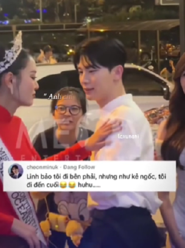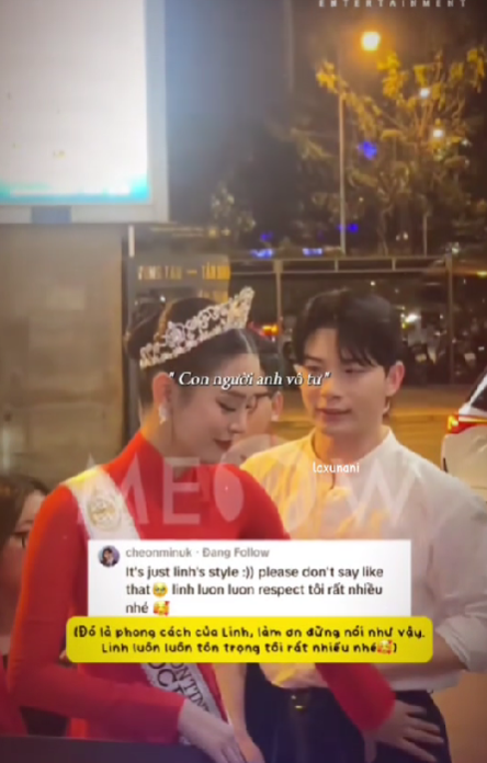 Giữa cơn bão chỉ trích đổ dồn về phía Á hậu Khánh Linh trong ngày đầu trở về, Cheon Minuk lên tiếng phân trần cho "bạn gái tin đồn". Anh bình luận trong một clip TikTok: "Linh bảo tôi đi bên phải, nhưng như kẻ ngốc, tôi đi đến cuối huhu", "Đó là phong cách của Linh. Làm ơn đừng nói như vậy. Linh luôn luôn tôn trọng tôi rất nhiều nhé."
