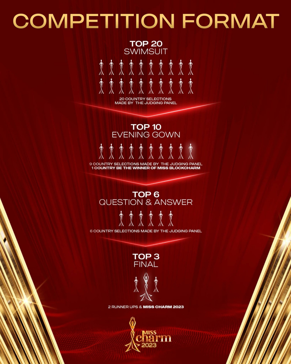 Mới đây, BTC cuộc thi đã tung format chính thức của Miss Charm 2023. Theo đó, từ 40 thí sinh ban đầu sẽ chọn ra 20 thí sinh, Top 20 sẽ trình diễn áo tắm. Top 10 sẽ có cơ hội trình diễn trang phục dạ hội. Từ Top 10 sẽ lựa chọn ra Top 6 (thay vì Top 5 như các cuộc thi khác) để vào vòng ứng xử. Sau đó sẽ Top 3 chung cuộc với ngôi vị Hoa hậu và 2 Á hậu.