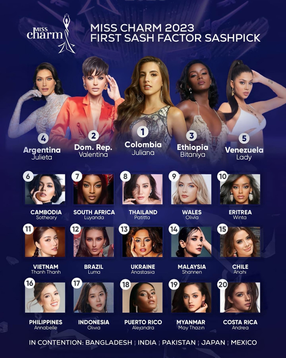 Tính đến thời điểm hiện tại, Miss Charm 2023 đã có 40 người đẹp, đến từ 40 quốc gia và vùng lãnh thổ ghi danh. Trước thềm cuộc thi, chuyên trang sắc đẹp quốc tế Sash Factor đã đưa ra BXH dự đoán đầu tiên. Theo đó, người đẹp Thanh Thanh Huyền đại diện cho Việt Nam được dự đoán sẽ giành vị trí thứ 11.