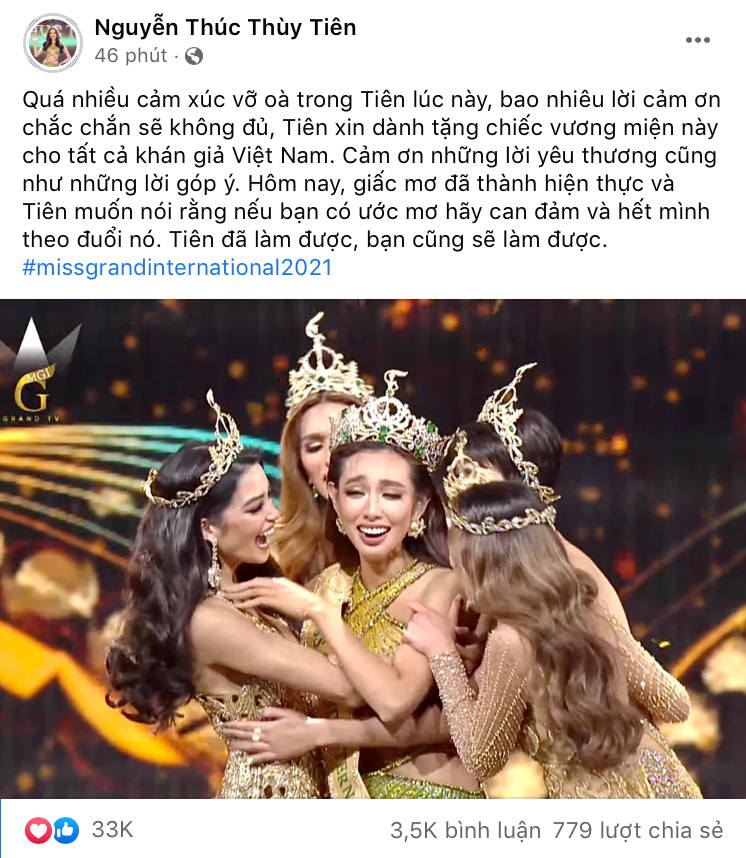 Ngay sau khi đăng quang, tân Hoa hậu Hòa bình Quốc tế 2021 đã có dòng chia sẻ đầu tiên trên fanpage. Cụ thể, người đẹp sinh năm 1998 chia sẻ: "Quá nhiều cảm xúc vỡ oà trong Tiên lúc này, bao nhiêu lời cảm ơn chắc chắn sẽ không đủ, Tiên xin dành tặng chiếc vương miện này cho tất cả khán giả Việt Nam. Cảm ơn những lời yêu thương cũng như những lời góp ý. Hôm nay, giấc mơ đã thành hiện thực và Tiên muốn nói rằng nếu bạn có ước mơ hãy can đảm và hết mình theo đuổi nó. Tiên đã làm được, bạn cũng sẽ làm được".